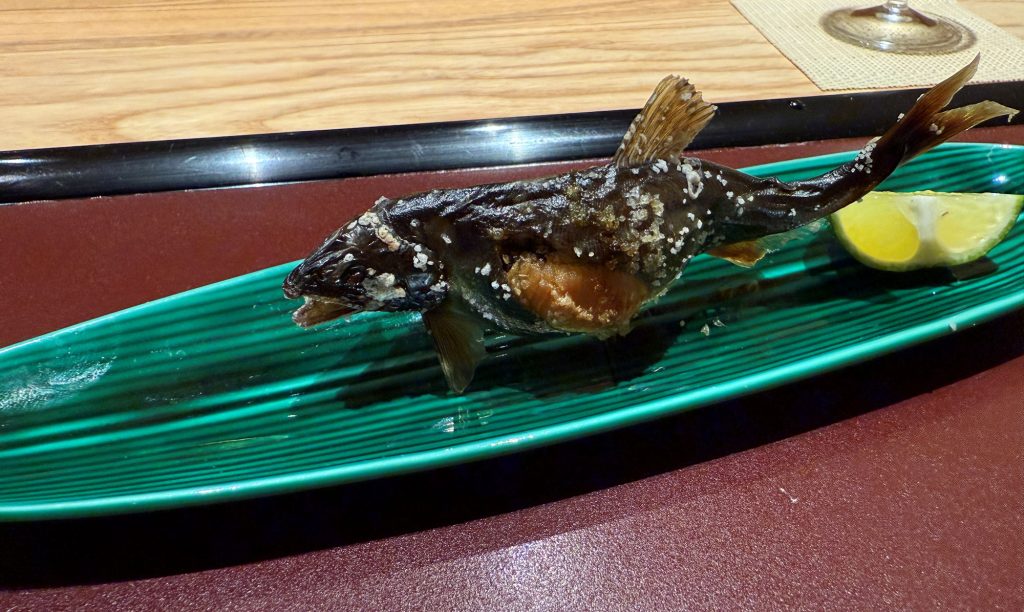 京都の料理屋さんで子持ち鮎をいただきました。親方が生きている子持ち鮎が透明のビニール袋に入っているのを見せながら「今から焼きます」。私は思わず手を合わせ「自然の恵みをいただきます、ゴメンナサイ」と。お皿の上で生きているような姿でした。